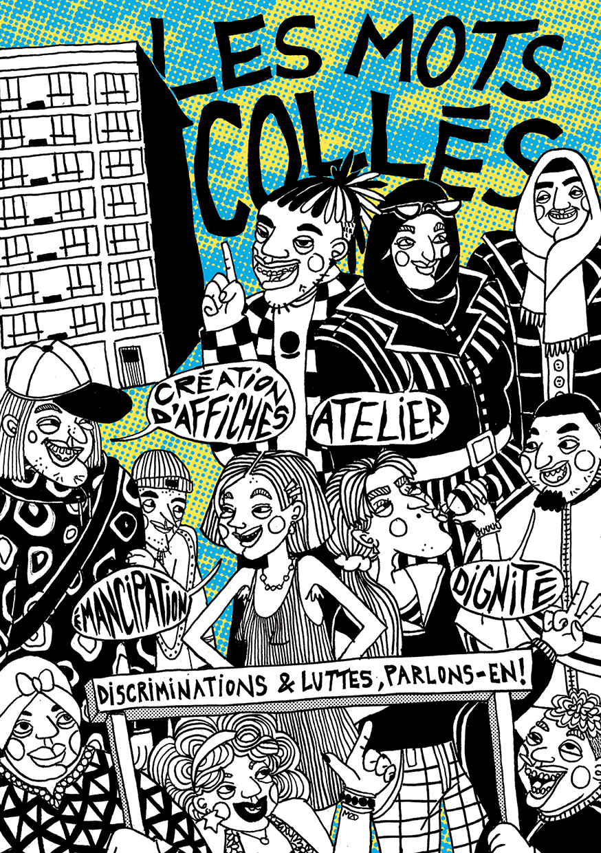 Les artistes photographes Cléa Mbaki et Sirandou Soukouna ont proposé des ateliers de création visuelle autour des thématiques des discriminations et des luttes. Les participant.e.s âgé.e.s de 12 à 18 ans ont pu traiter ces questions au travers de diverses pratiques artistiques : photographie, dessins ou encore initiation au graphisme. Les artistes ont tenu à créer un espace d’écoute et de parole où les jeunes, tous.tes issu.e.s du Haut-Montreuil, ont pu partager leurs expériences du racisme, de l’islamophobie, du classisme et de l’homophobie. Cela a donné lieu à la création d’affiches aux messages revendicatifs et politiques, inspirés des collages féministes.